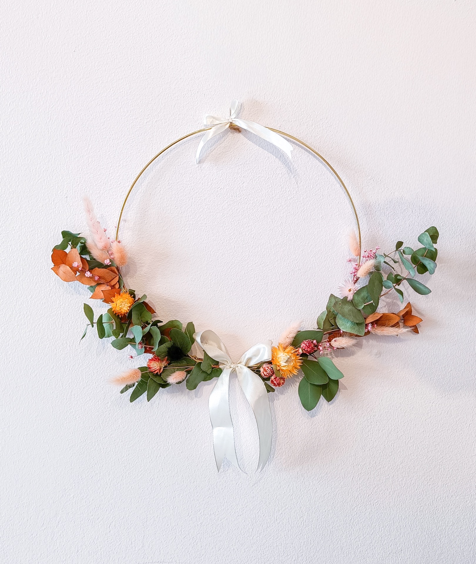 Materiaalit: laadukkaat kuivakukat, silkkinauhat, valkoinen kranssipohja (20 cm halkaisija) ja kaikki tarvittava sisältyy hintaan.