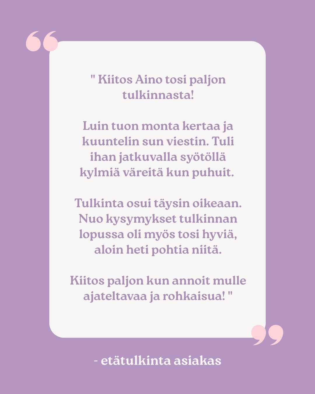 Tulkinnan sisältö toimitetaan Instagramin yksityisviestillä (tai tarvittaessa Whatsappin kautta) 14 vuorokauden sisällä ostoksesta (myös nopeamminkin).